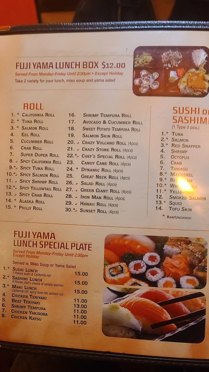 Welcome to Fujiyama Sushi Bar, a hidden gem located at 2861 Lynnhaven Dr in Virginia Beach. This sushi haven delights with a menu that features both classic and innovative offerings. The sushi and sashimi a la carte boasts options like the tender Octopus Tako and rich Ikura Salmon caviar, each priced affordably. Specialty rolls such as the Jim White Fitness Roll showcase creative combinations of spicy shrimp and avocado, perfect for health-conscious diners.